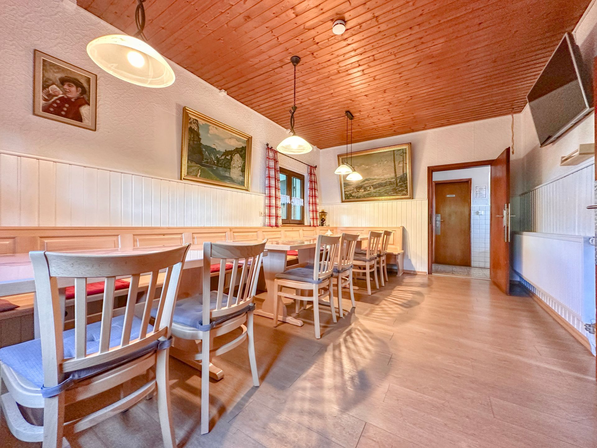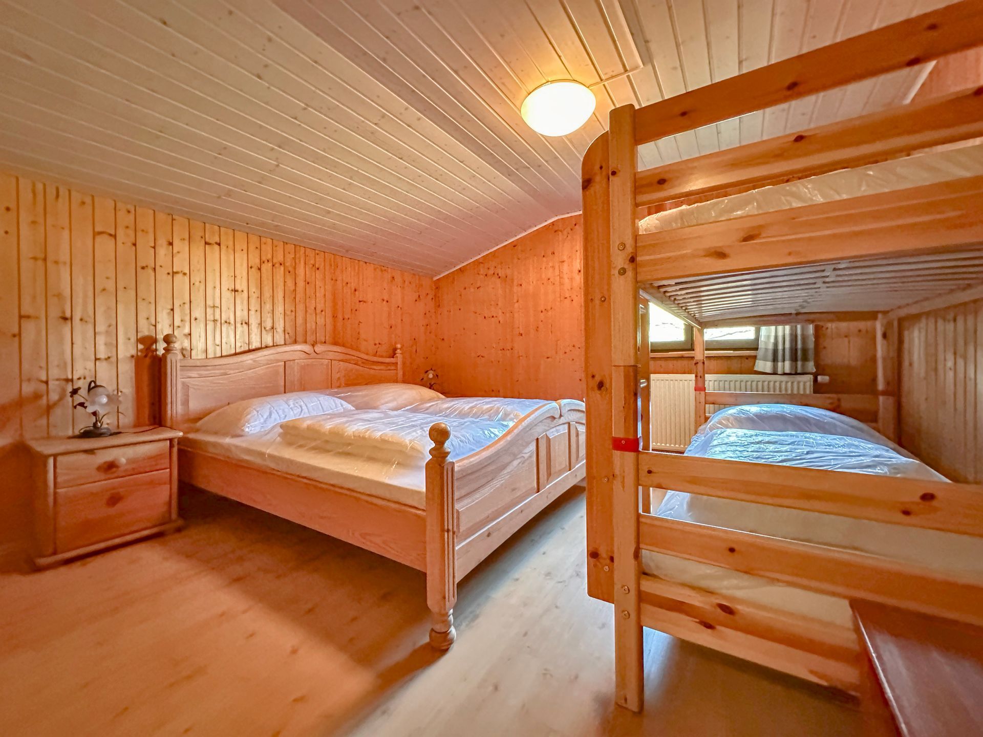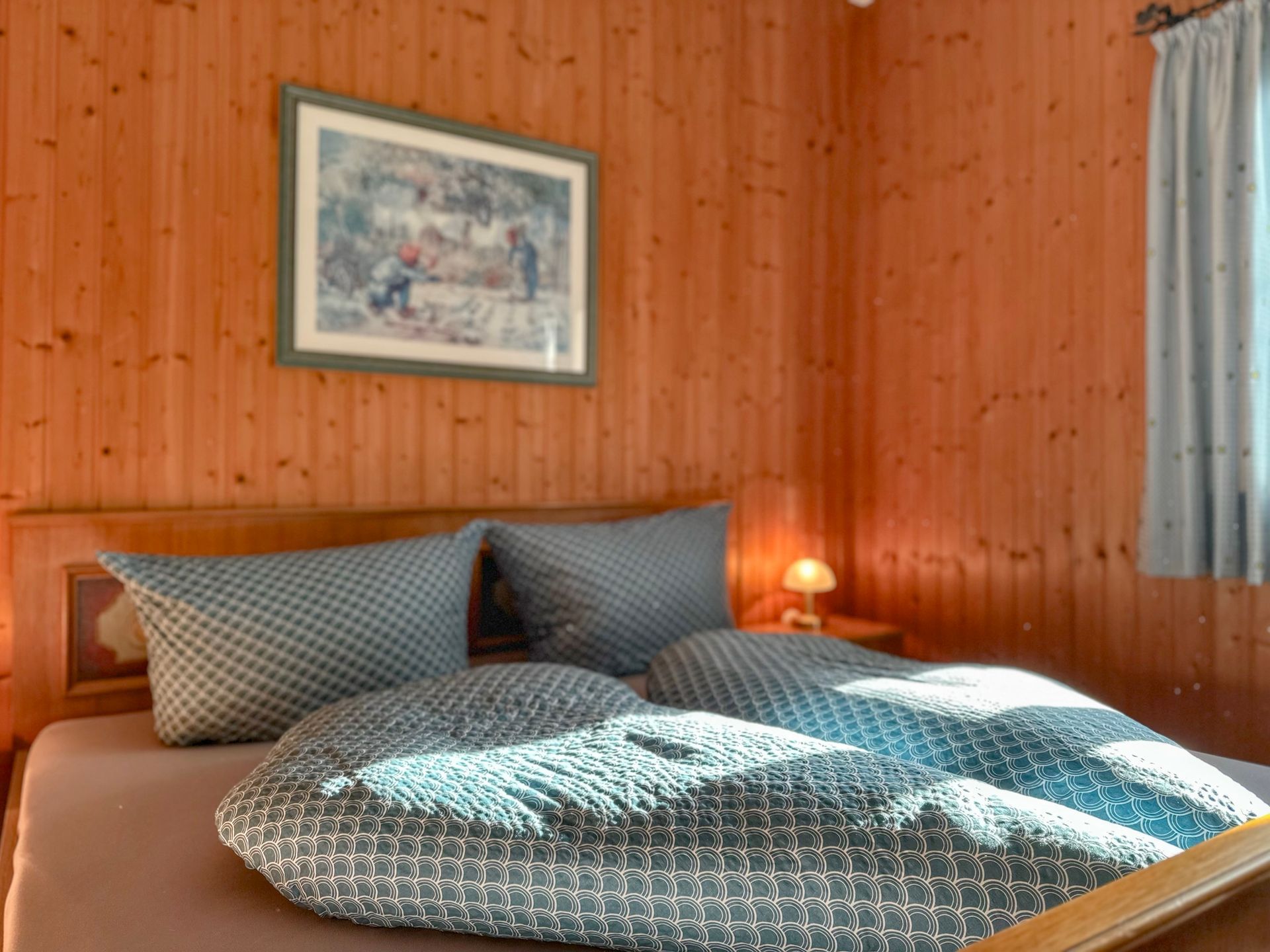 Herzstück des Hauses ist der große Aufenthaltsraum mit TV im Erdgeschoss, in dem sich alle Gäste versammeln können – sei es zum gemeinsamen Essen, für Spieleabende oder einfach zum Zusammensitzen in geselliger Runde. Eine praktische und vollausgestattete Küchennische mit allen wichtigen Elektrogeräten macht die Selbstversorgung leicht. Das Erdgeschoss wird abgerundet durch ein Schlafzimmer sowie ein Badezimmer mit separatem WC.