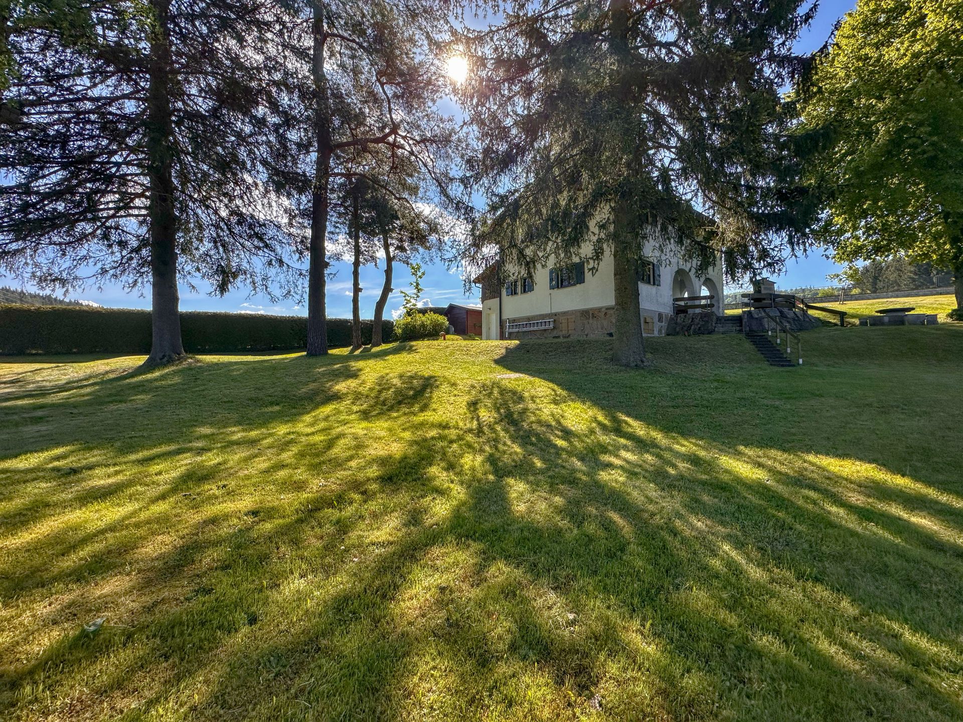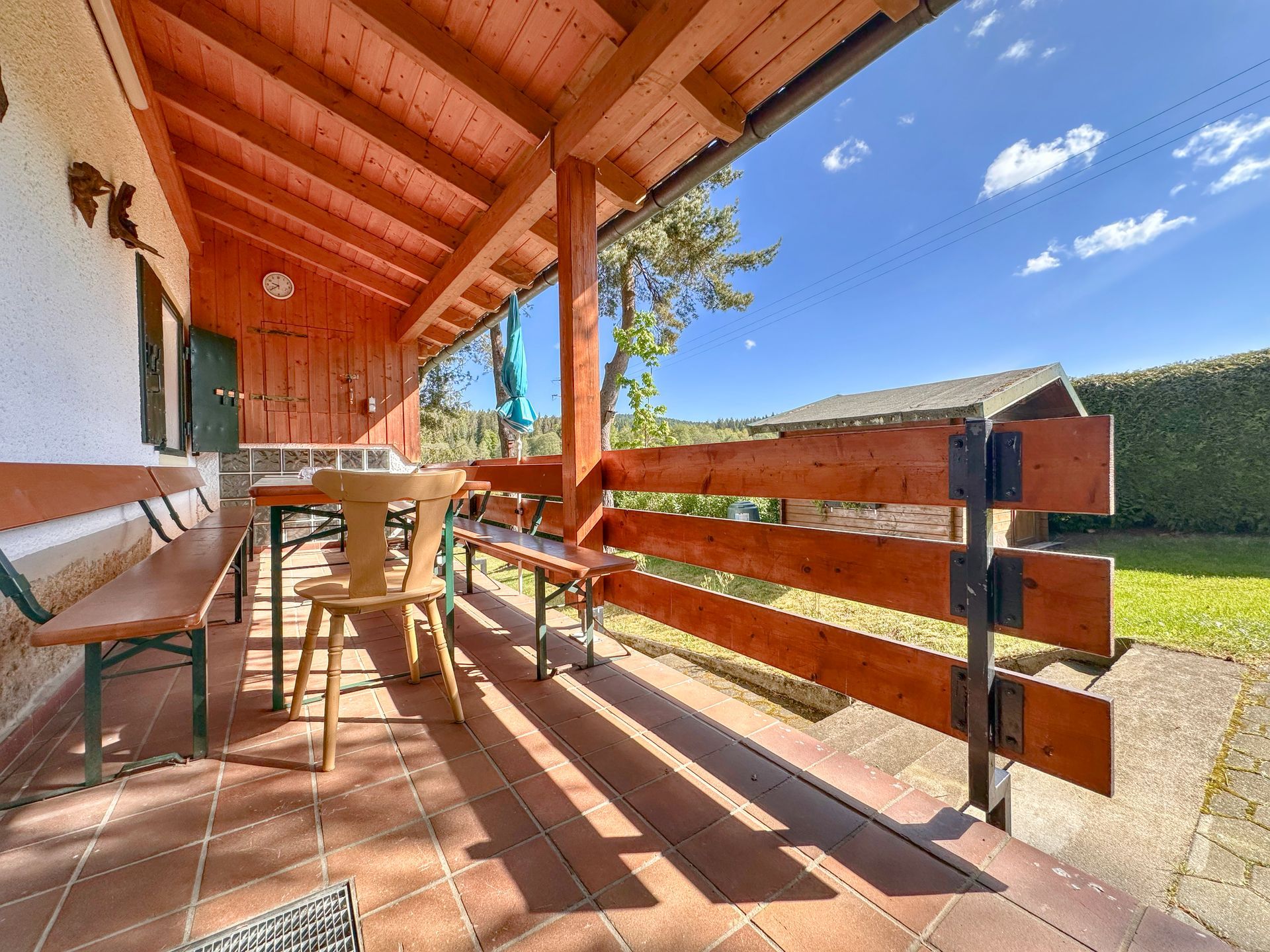 Im Außenbereich warten gleich zwei überdachte Terrassen, mehrere Sitzgruppen, Sonnenschirme und Liegestühle auf Sie. Für das besondere Hüttenfeeling sorgen ein freistehender Gartengrill und eine Tischtennisplatte – perfekt für gesellige Stunden unter freiem Himmel. Das gepflegte, komplett eingezäunte Grundstück mit seinem alten Baumbestand steht ausschließlich Ihnen zur Verfügung und schafft ein einzigartiges Gefühl von Privatsphäre und Ruhe.